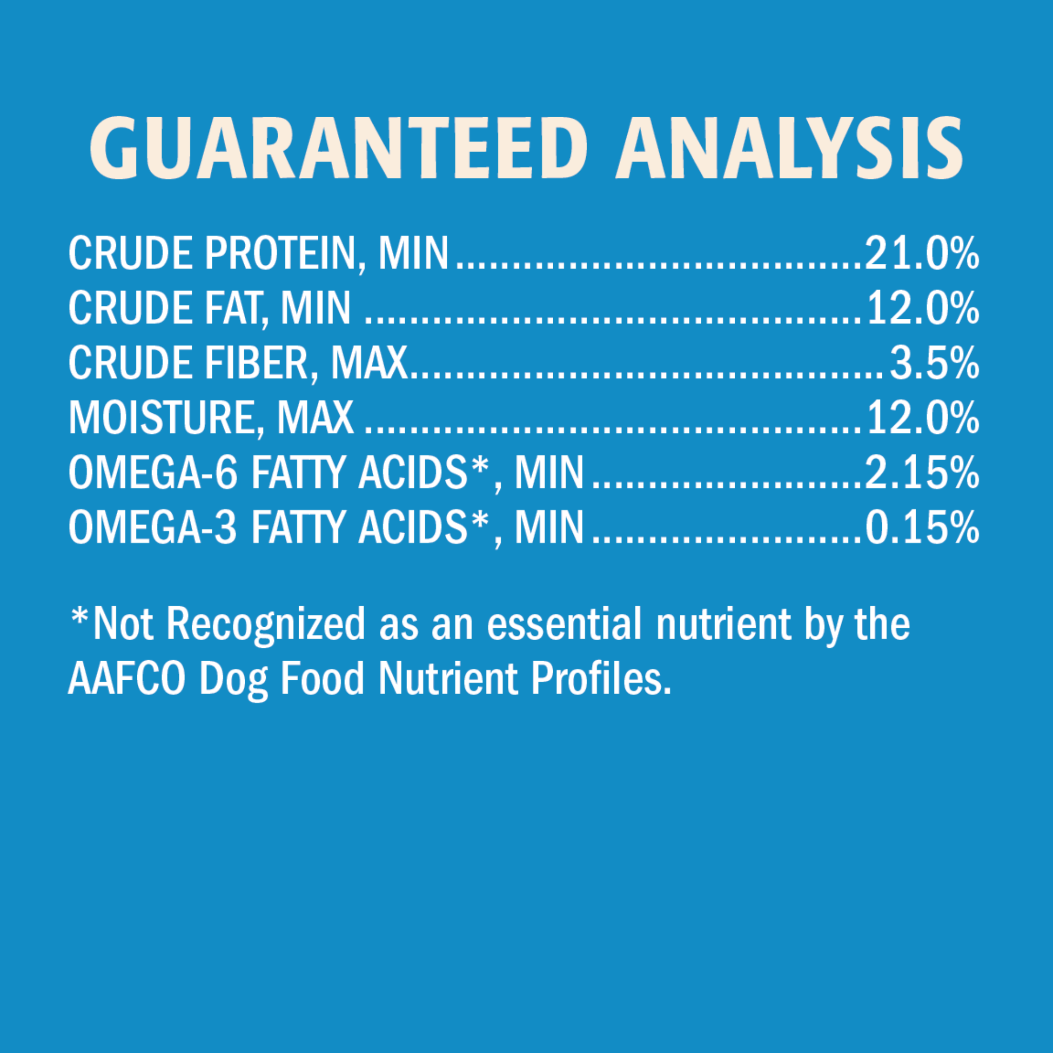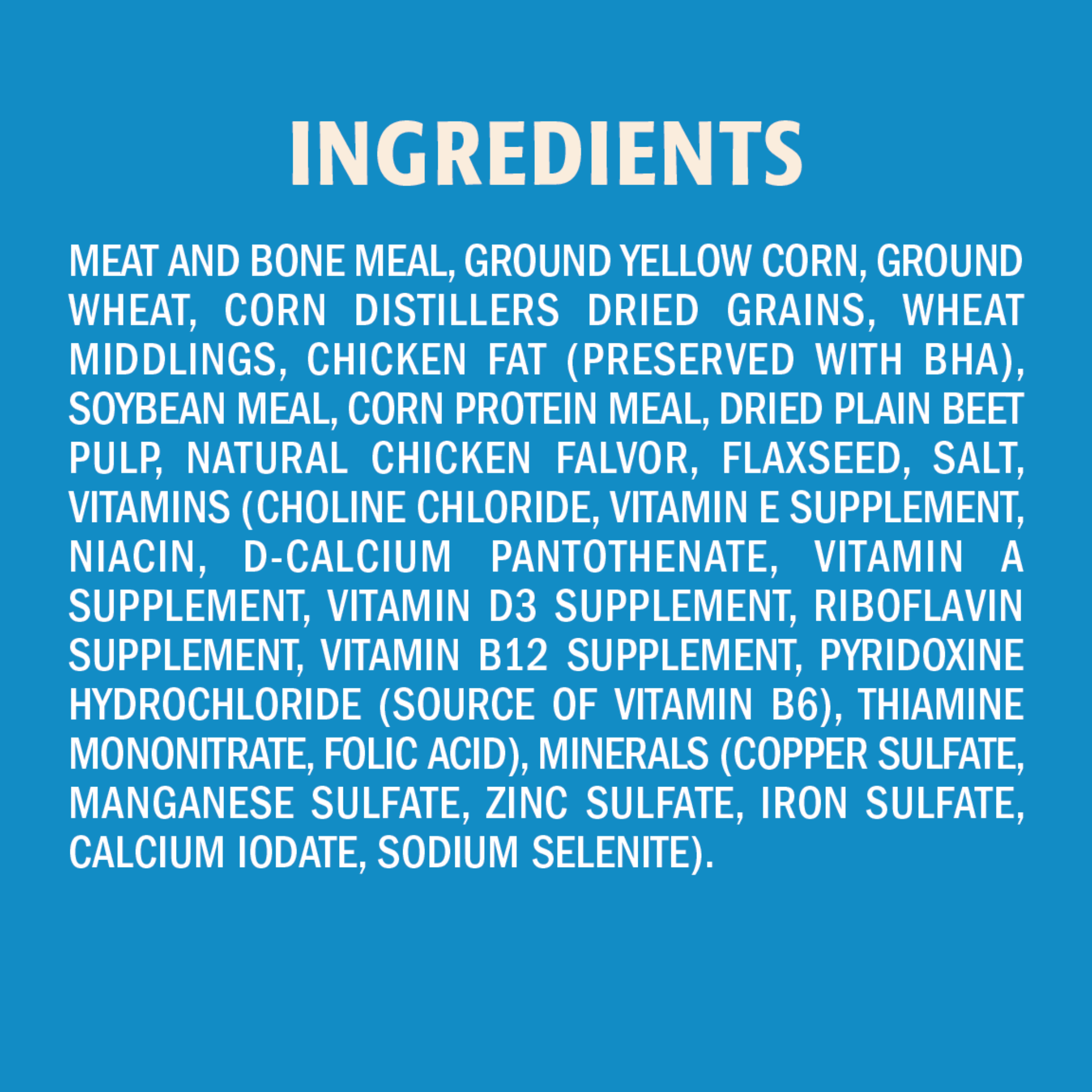 Harina de carne y hueso, maíz amarillo molido, trigo molido, granos secos de destilería de maíz, salvado fino de trigo (middlings), grasa de pollo (conservada con BHA), harina de soya, harina de gluten de maíz, pulpa de remolacha deshidratada sin melaza, sabor natural de pollo, semilla de linaza, sal, vitaminas (cloruro de colina, suplemento de vitamina E, niacina, D-pantotenato de calcio, suplemento de vitamina A, suplemento de vitamina D3, suplemento de riboflavina, suplemento de vitamina B12, clorhidrato de piridoxina [fuente de vitamina B6], mononitrato de tiamina, ácido fólico), minerales (sulfato de cobre, sulfato de manganeso, sulfato de zinc, sulfato de hierro, yodato de calcio, selenito de sodio).
