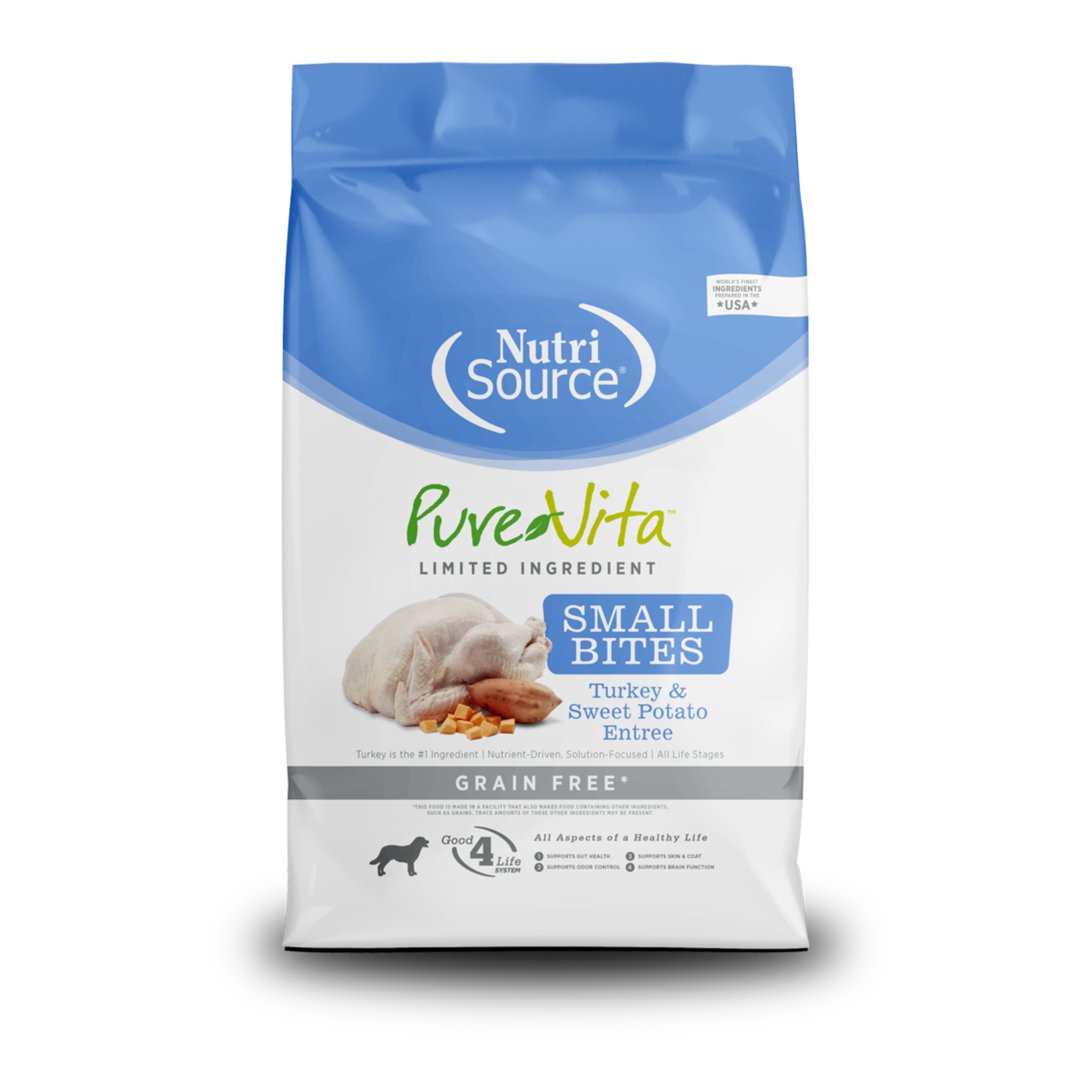 El alimento para perros sin cereales NutriSource® PureVita™ Small Bites, plato principal de pavo y batata, está formulado para cumplir con los niveles nutricionales establecidos por los perfiles de nutrientes de alimentos para perros de la Asociación Estadounidense de Oficiales de Control de Alimentos (AAFCO) para todas las etapas de la vida, incluido el crecimiento de perros de gran tamaño (70 libras o más en la edad adulta).