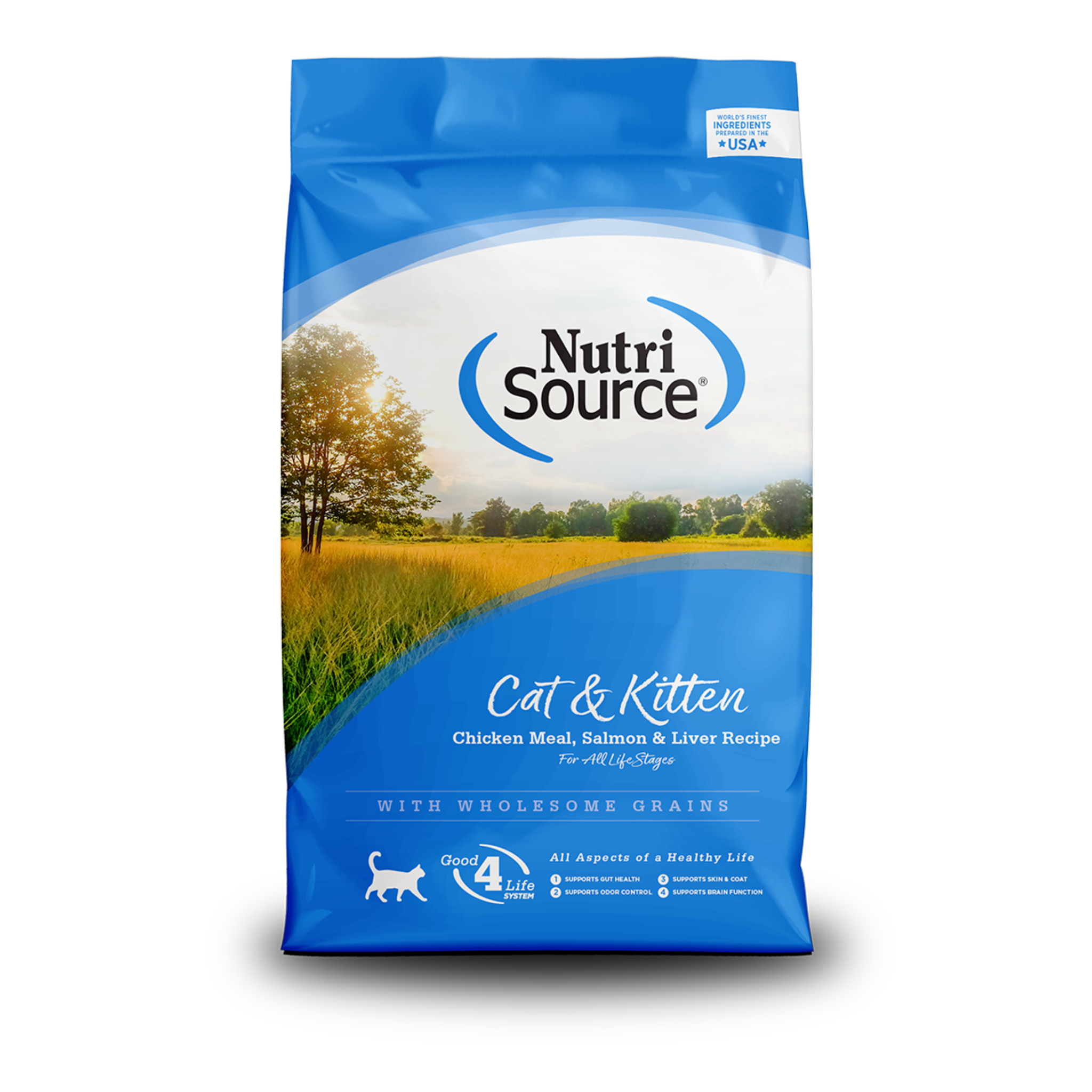 La receta de harina de pollo, salmón e hígado para gatos y gatitos NutriSource® está formulada para cumplir con los niveles nutricionales establecidos por los perfiles de nutrientes de alimentos para gatos de la Asociación Estadounidense de Funcionarios de Control de Alimentos (AAFCO) para todas las etapas de la vida.