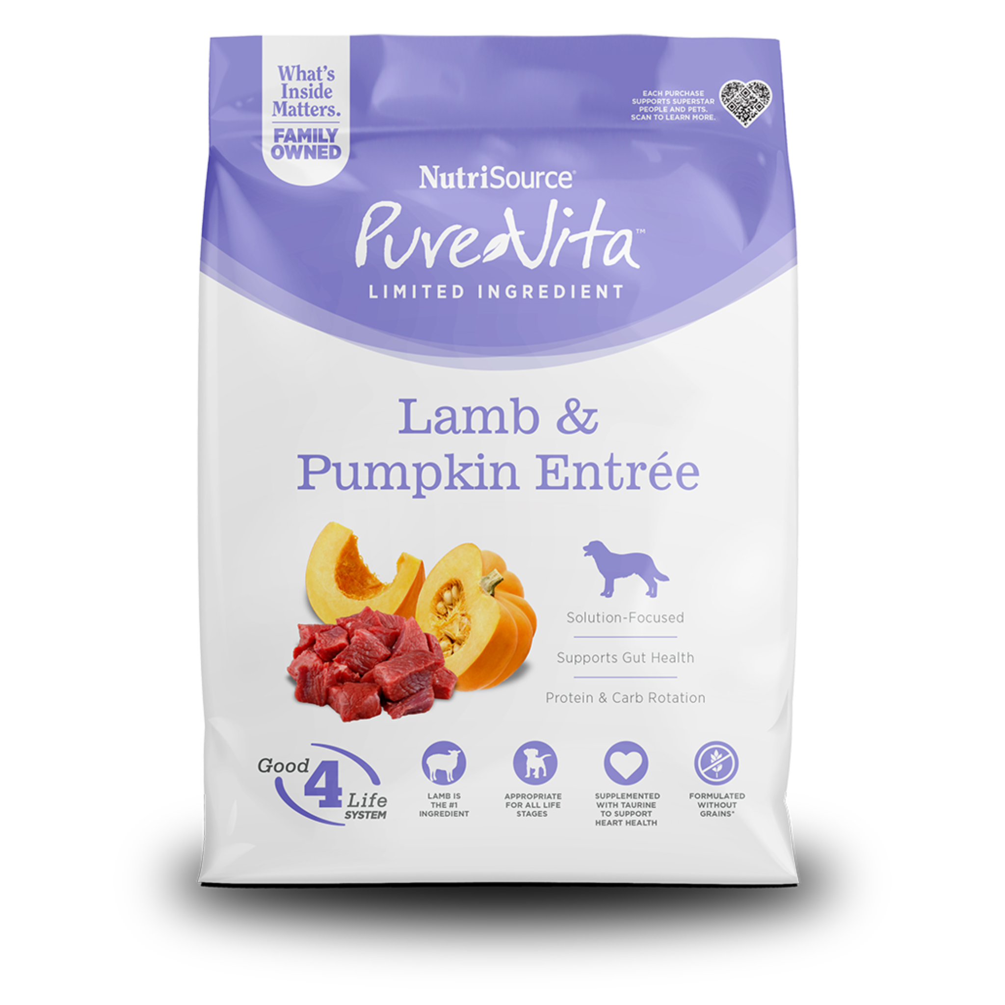El alimento para perros sin cereales NutriSource® PureVita™ Lamb & Pumpkin Entrée está formulado para cumplir con los niveles nutricionales establecidos por los perfiles de nutrientes de alimentos para perros de la AAFCO para todas las etapas de la vida, excepto para el crecimiento de perros de gran tamaño (32 kg [70 lbs] o más en la edad adulta).