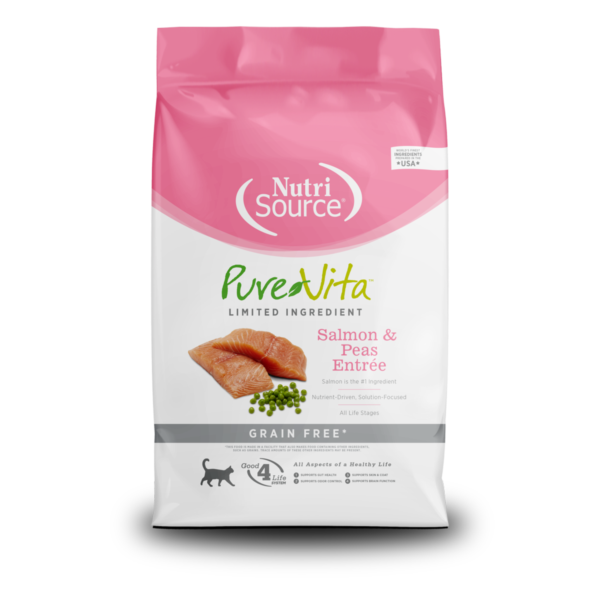 NutriSource® PureVita™ Salmon & Peas Entrée Grain Free Cat Food está formulado para cumplir con los niveles nutricionales establecidos por los perfiles de nutrientes de alimentos para gatos de la Asociación Estadounidense de Funcionarios de Control de Alimentos (AAFCO) para todas las etapas de la vida.